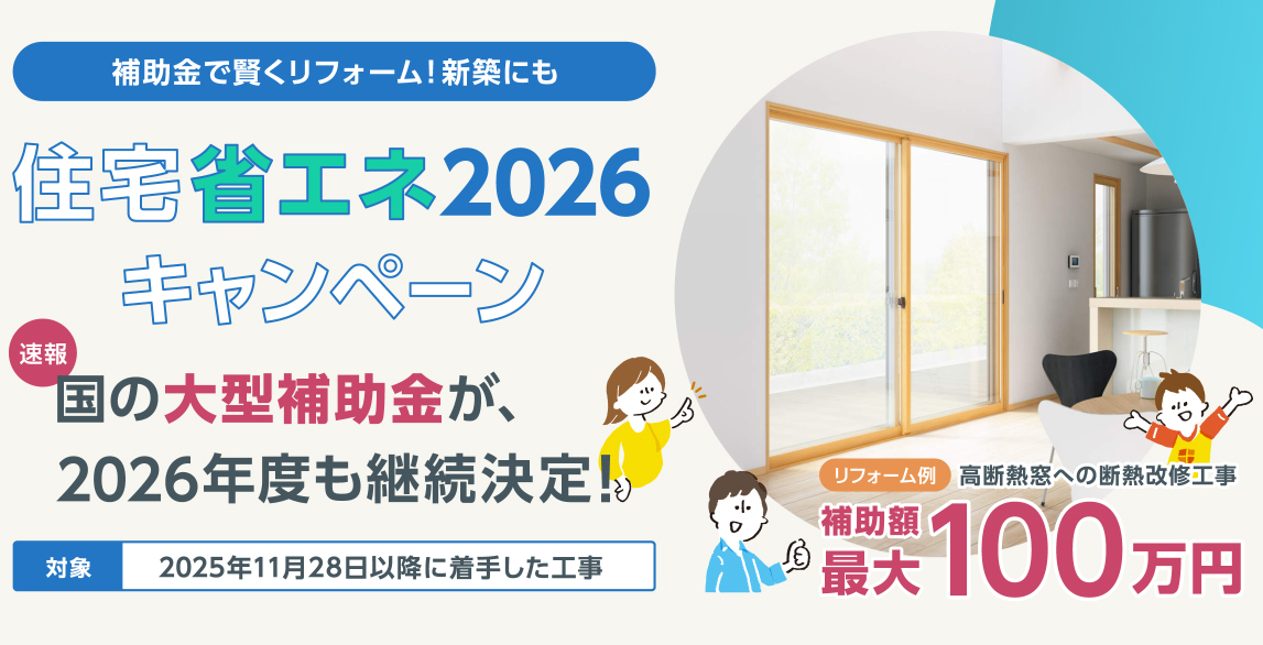 住宅の省エネ化を目的として国が推進している大型の補助金事業です。2023年~2025年より若干予算規模が縮小しながらも、2026年も継続して国土交通省・経済産業省・環境省の3省が連携した4事業が展開されることが決まりました。 [詳しくはこちら]