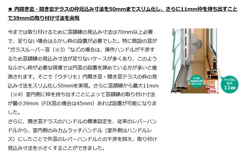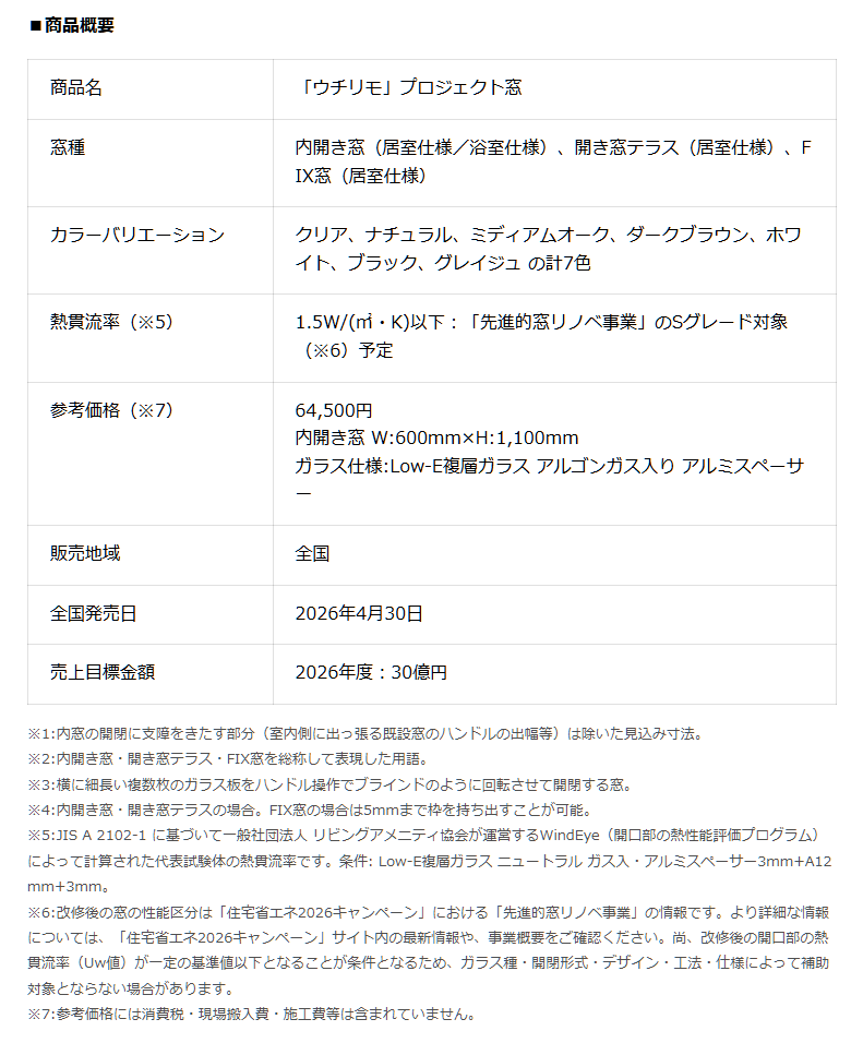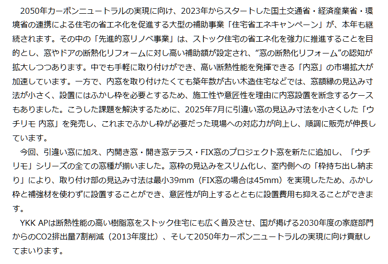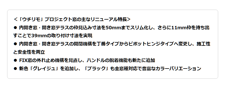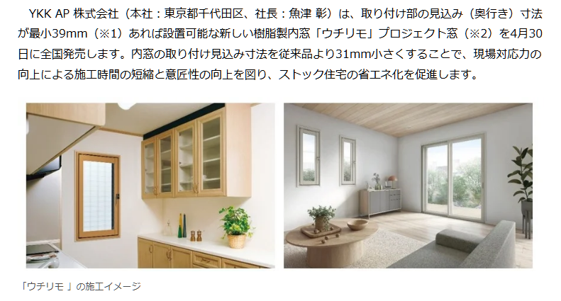 YKK APは、断熱性を高めるリフォーム用樹脂製内窓「ウチリモ」プロジェクト窓を4月30日に発売します。従来品より取り付けに必要な奥行きを31mm縮小し、最小39mmでの設置を実現しました。これにより、古い住宅などの狭い窓枠でも大がかりな補強枠なしで手軽に施工が可能になります。現場での施工時間短縮やデザイン性の向上、費用の抑制を実現し、国の補助金制度も活用しながら既存住宅の省エネ化を強力に推進します。